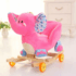 Material: cadru din lemn, roti din plastic si captuseala figurinei din plus moale si catifelat.