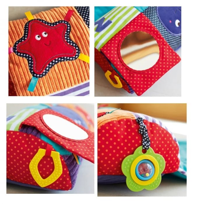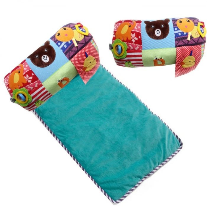 Aseaza salteluta pe o suprafata plana, pozitioneaza pernuta sub pieptul bebelusului pentru suport si permite-i sa exploreze jucariile atasate si texturile captivante. Poate fi utilizata si pentru joaca pe spate.