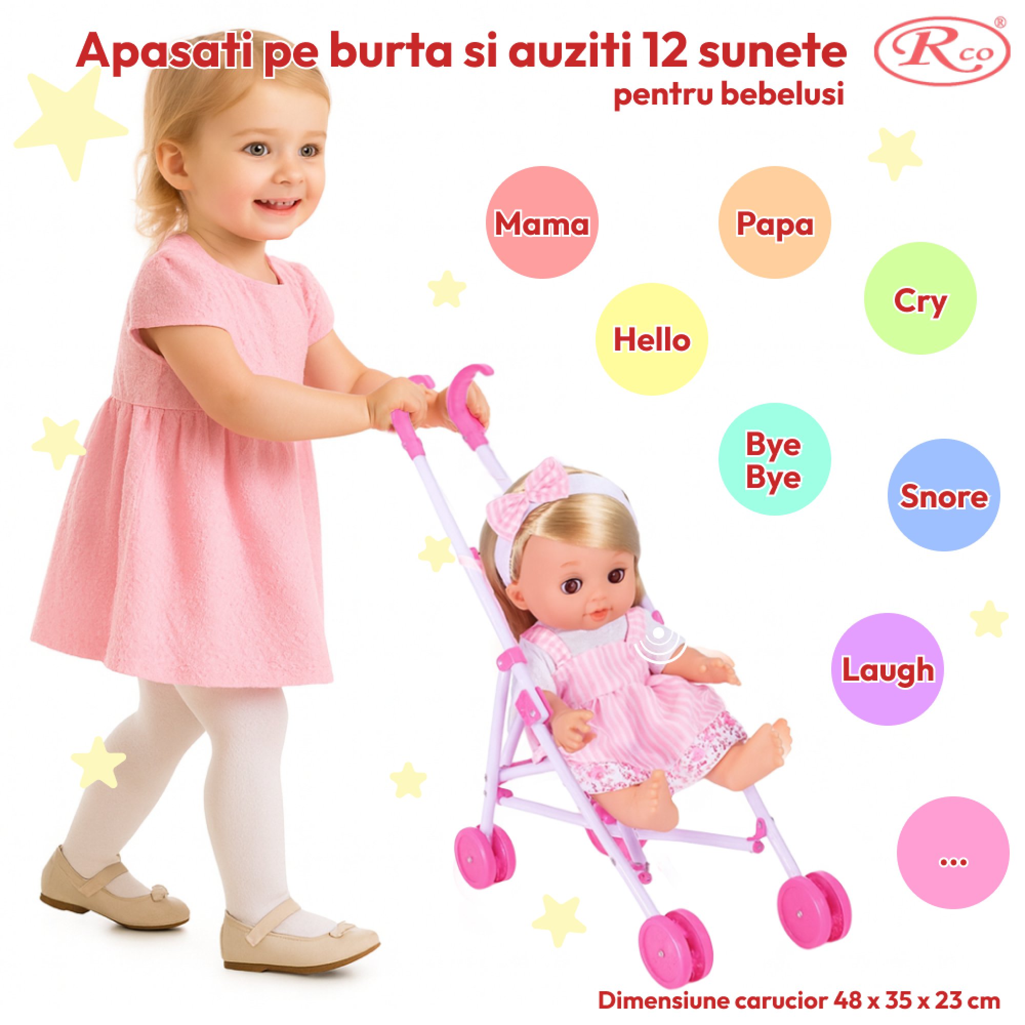 Set Papusa interactiva cu 12 sunete, carucior si accesorii este cadoul perfect pentru orice fetita. Are toate accesoriile necesare pentru ca acesta sa se joace si sa invete in acelasi timp sa fie responsabila.