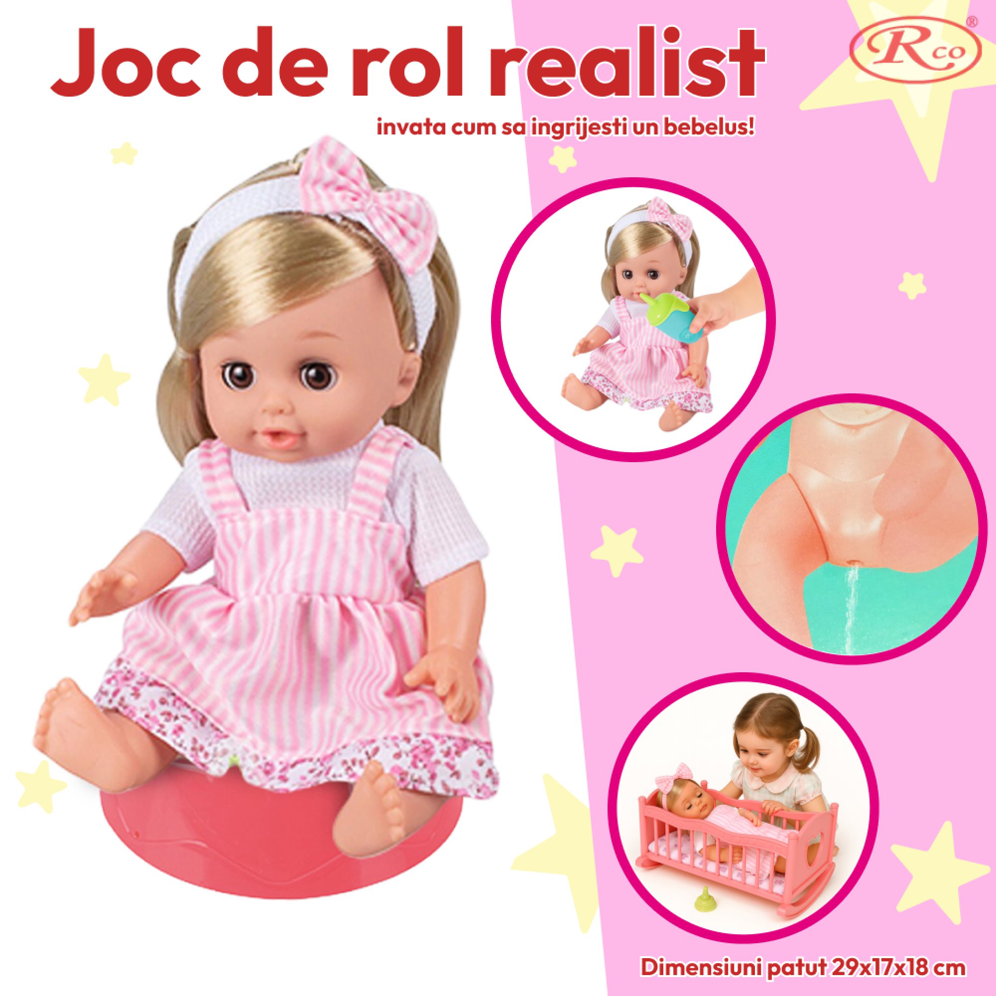 Un set excelent pentru jocurile de Role-play- ingrijirea bebelusului Joaca cu papusi este una dintre cele mai atractive moduri de joaca a fetitelor, prin aceasta invatand si imitand cam tot ce face mami. Copiii pot intelege mai bine rolul parintilor si provocarile pe care le implica cresterea unui copil.