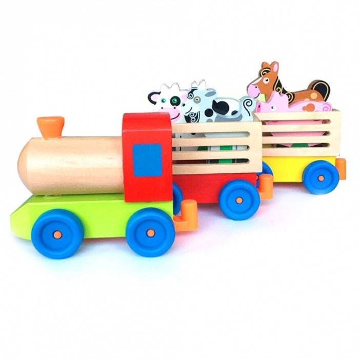 Confectionat din lemn de cea mai buna calitate, vopseluri non toxice, trenuletul transporta 4 animale.